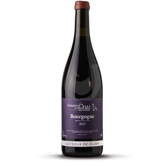 Le Bourgogne Rouge du Domaine de la Cras (Marc Soyard) exprime une philosophie profondément libre et vivante — culture biologique d’inspiration biodynamique et vinifications sans intrants ou presque — appliquée à des Pinot Noir issus des coteaux préservés autour de Dijon, où des sols argilo-calcaires donnent des vins frais et précis, vinifiés en levures indigènes avec une part de grappes entières, macérations douces et élevage en fûts sans collage ni filtration, pour offrir un rouge délicat et énergique, aux arômes de cerise, de fruits rouges et d’épices, porté par des tanins souples, une belle buvabilité et une finale fine, droite et minérale.