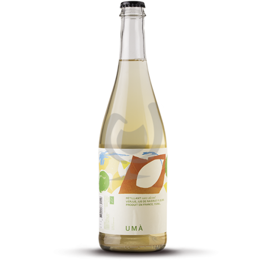 Umà PET'NAT Blanc est une boisson pétillante sans alcool inspirée des vins pétillants naturels. Il est élaboré à partir de verjus et de jus de raisin blanc gazéifiés, infusés avec un bouquet de plantes aromatiques, offrant un résultat sec et minéral.