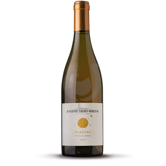 Austral est un vin orange de gastronomie ! Le vin s’ouvre à l’oxygénation et passera par une panoplie d’arômes complexes. La structure tannique, assez présente, s’affinera avec le temps. Un carafage détendra le vin. Terroir argilo-calcaires de l'époque du Trias. 80% Roussanne, 15% Grenache Blanc, 5% autres (vignes de 20 à 40 ans). Suite à de divers raisonnements et dégustations, les vinifications en blanc ont été totalement redéfinies à la Ferme Saint-Martin en 2011. Il en résulte un “blanc de macération” à partir du millésime 2016. Les terres Australes sont les plus méridionales de la planète, un clin d’oeil au terroir sudiste donc ! Le ciel Austral (que l’on observe depuis l’hémisphère sud) est bien différent de celui que l’on observe dans cette région. Clin d’oeil ici à une vinification inhabituelle, mais qui date de l’Antiquité. Sols travaillés mécaniquement entre les pieds de vignes, entretien d’un tapis végétal entre les rangées. Rendement : de 28 à 32 hl/h. Récolte manuelle, tri manuel, égrappage total. Vinifié sans aucun ajout de produit œnologique. Macération d’environ une semaine. Élevage 1 an en barrique ou demi-muid, puis 9 mois en bouteille avant commercialisation. Filtration douce sur plaque. Sans sulfites ajoutés. Peut être consommé jeune, apogée 2 à 5 ans, potentiel de garde de 8 à 10 ans en cave fraîche.